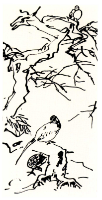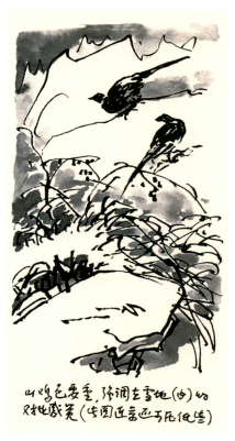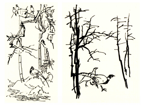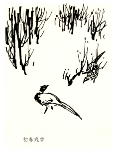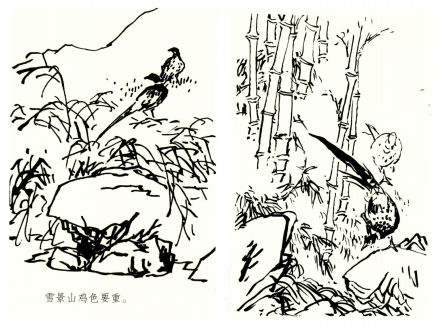 这里画的是雄雉,雄雉原来色调斑斓,因为雪地白色的对比,是以嗅觉油腻苍译,因而选拔重墨点染,强调的是嗅觉,不是按固有色照实描摹。