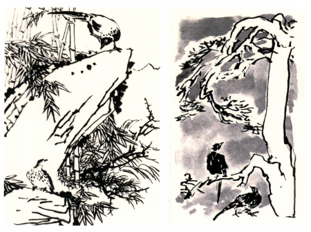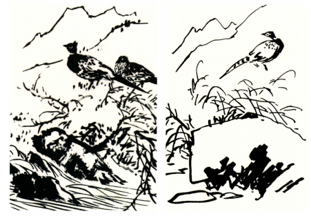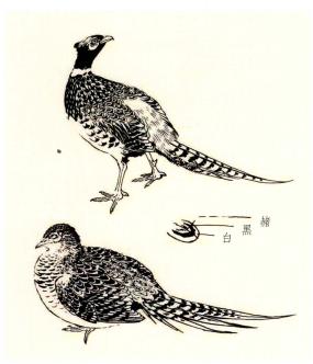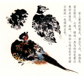 背上要用松笔点,留出飞白,给神色留出部位。山鸡、锦鸡一类的鸟的设色要戒备切勿画花、画碎。举例山鸡设色可用赭石作念斡旋色调的主色。