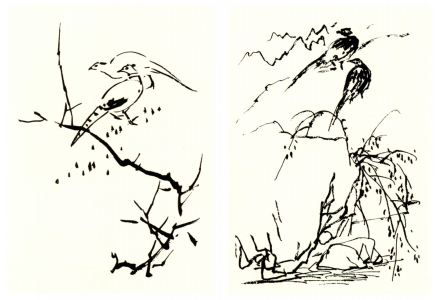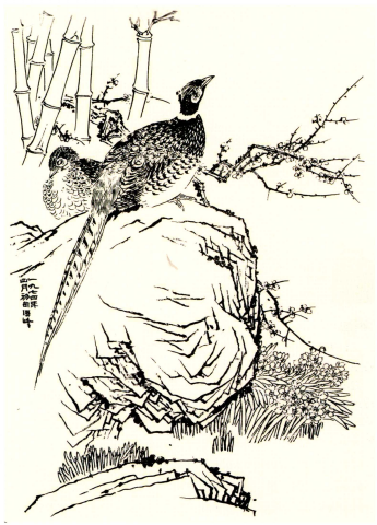 冠羽淡墨染,罩三青(极淡)丝毛。酡颜,朱砂涂,洋红点斑。头部墨丝点(要重),笔间留缝,染淡墨。脖上白圈粉染。前胸先画重墨斑,染淡墨,罩洋红(少调点花青),腹侧墨点斑,黄略加朱调粉染。背部带三角墨斑羽片用杏黄染。其下接肩羽与腰部羽毛,这些羽片都有重的墨底,再染赭,边际白色。尾上复羽染三绿,草绿丝毛,尖形小复羽半赭半三青,曲调不要太强,低级飞羽黑斑染赭,末稍留白。尾画法同。