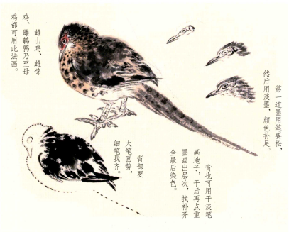 先以淡墨点画背部,留有笔触。同墨勾三级飞羽,并画覆羽,重墨勾嘴圈眼,朱磦少调胭脂画脸,胭脂点斑,重墨画头部,留出脖子上白圈。干后以头绿点头部闪光处,胸以胭脂调墨,下接赭墨,再转赭黄。重墨点花纹,重墨画低级飞羽,并提覆羽翎管。淡墨先画出尾上覆羽空洞,赭墨画尾,趁湿重墨点横斑,尾上覆羽近尾处染三青渐三绿,要淡与见笔,爪赭墨。嘴染淡花青,朱磦染眼。雌鸟,通身以淡墨戳点,要整碎聚合,并留有空缺,脸淡红,半干时再以重墨戳点,临了染赭石。如不及,可用重赭复点、重墨提点翎管。染色时不要平涂,爪、嘴同雄鸟。