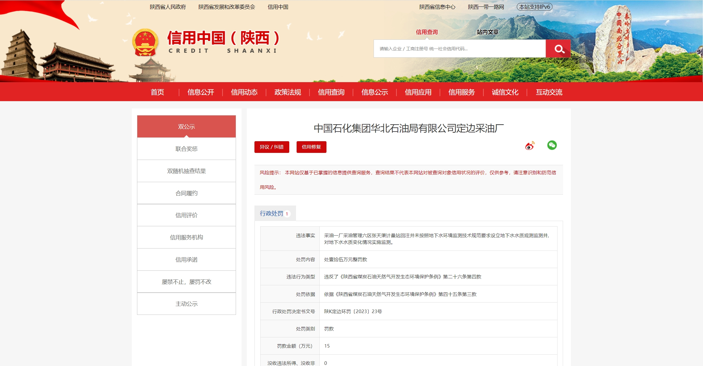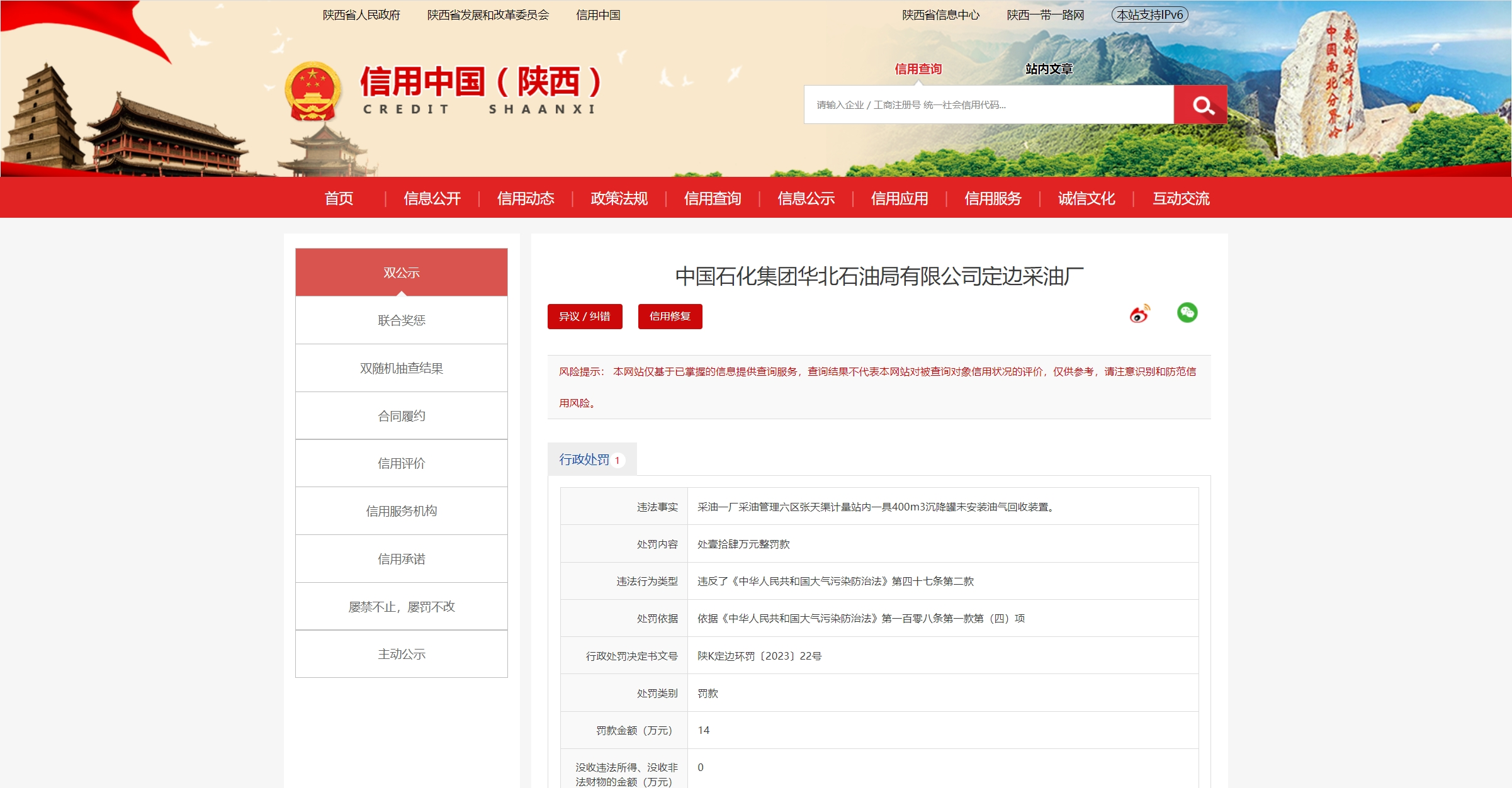 信用中国(陕西)网站露馅,近日uG环球棋牌,中国石化集团华北石油局有限公司定边采油厂被榆林市生态环境局连开两张罚单,罚金金额所有29万元。